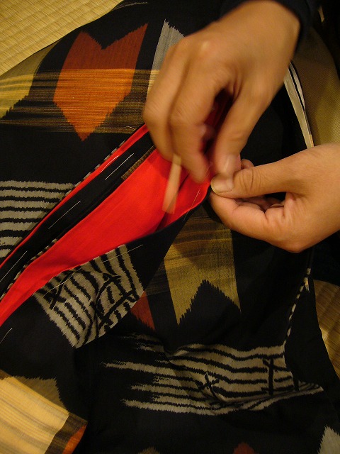 サイズを測ったり、半襟の縫い付けをしたり