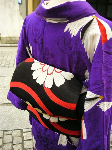 黒地に花の、存在感抜群な帯を合せてみました。