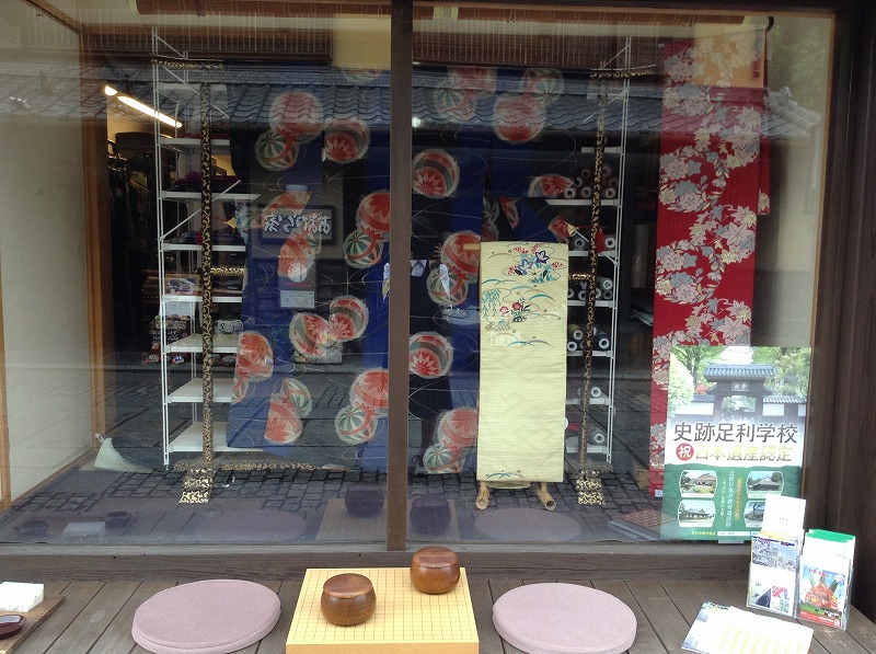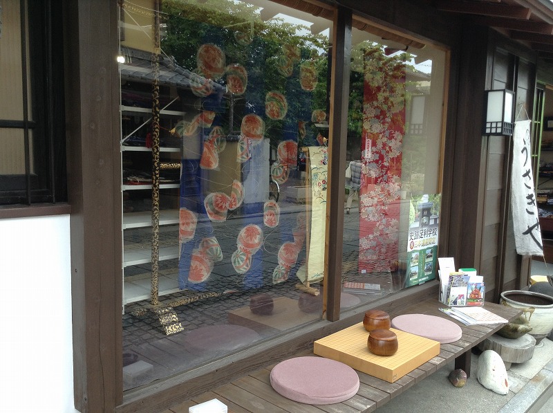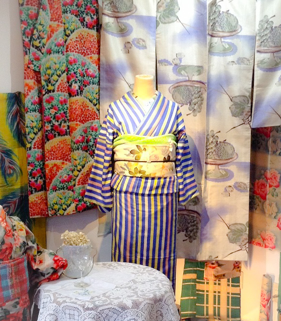 涼やかな色合いと手毬柄の一際目を引く夏銘仙は、表に面したウインドウに飾ることに。