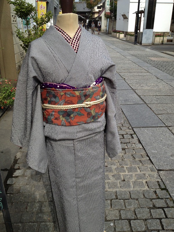 今度は細かい格子で遠目だと無地に見えるお着物に
