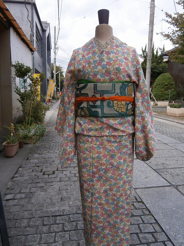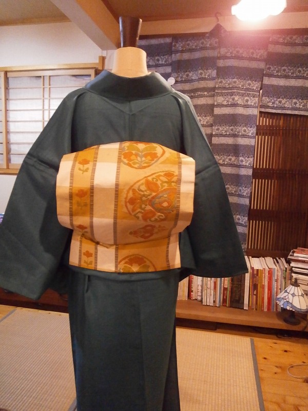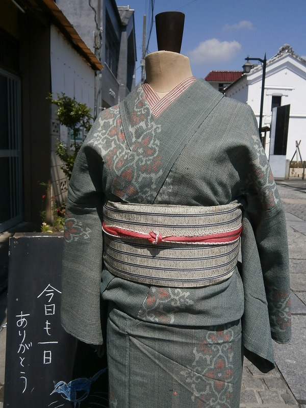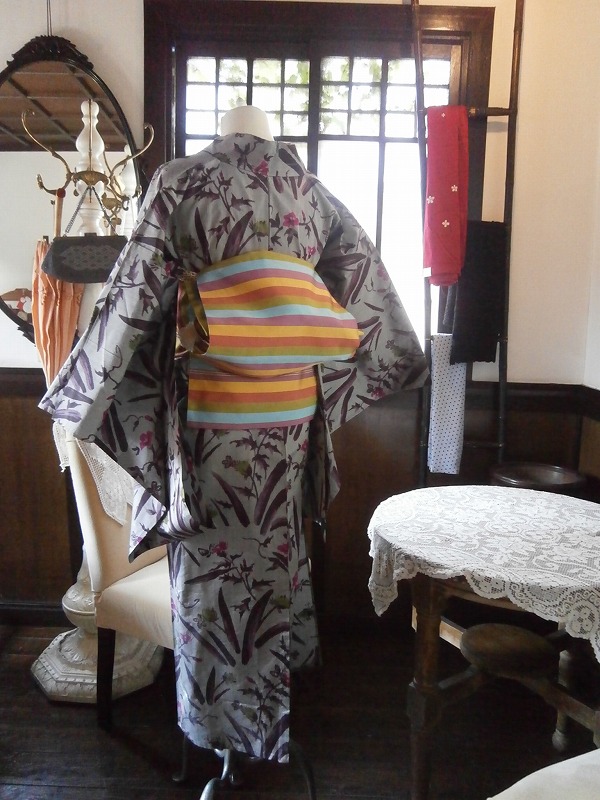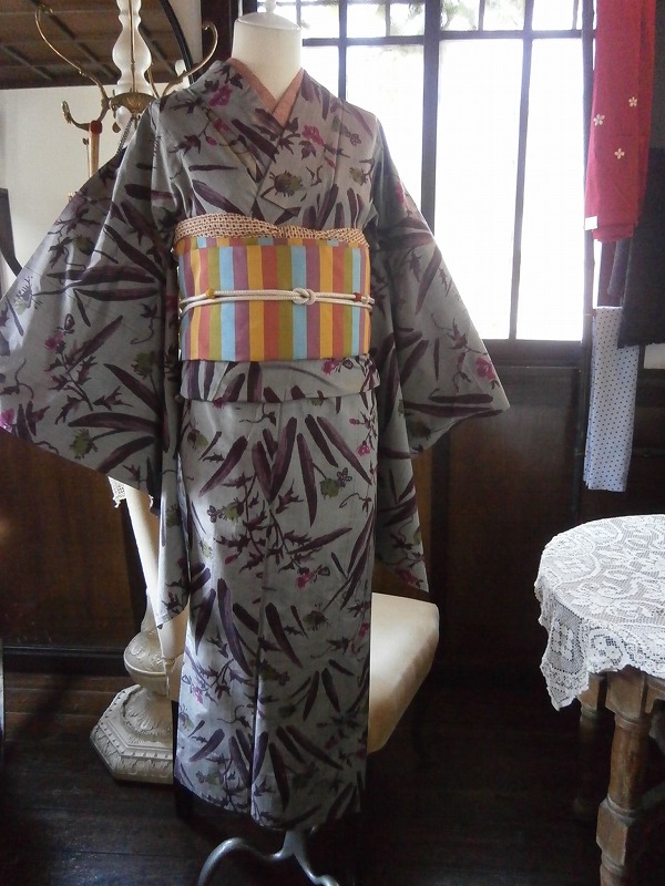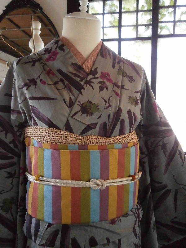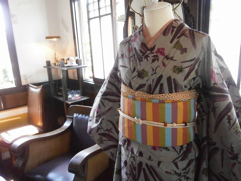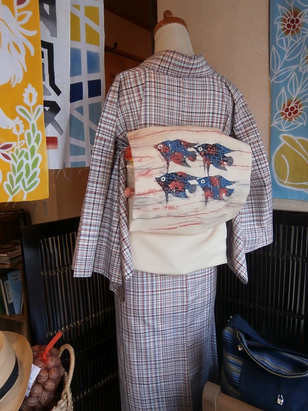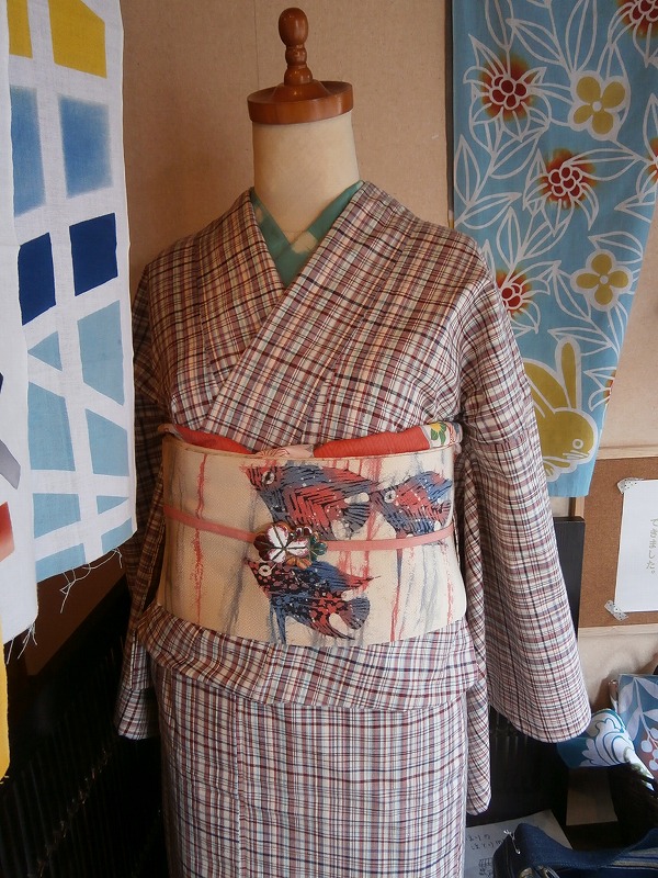 格子柄のキモノに熱帯魚の帯を締めてみました。