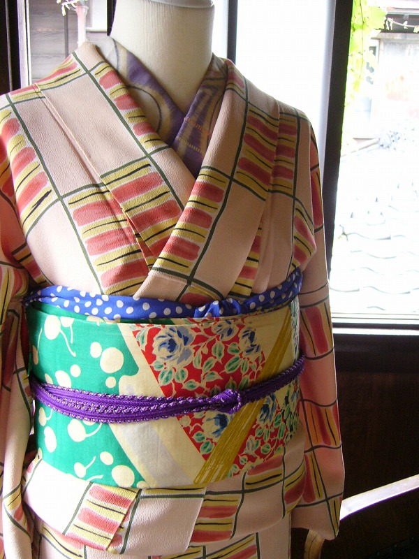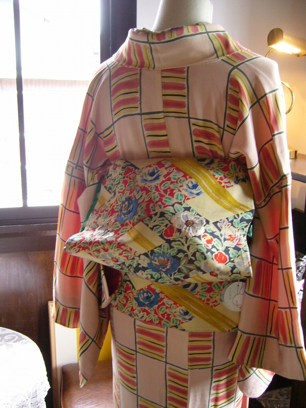 淡いピンク地に市松風にオレンジと黄色の縞模様が。