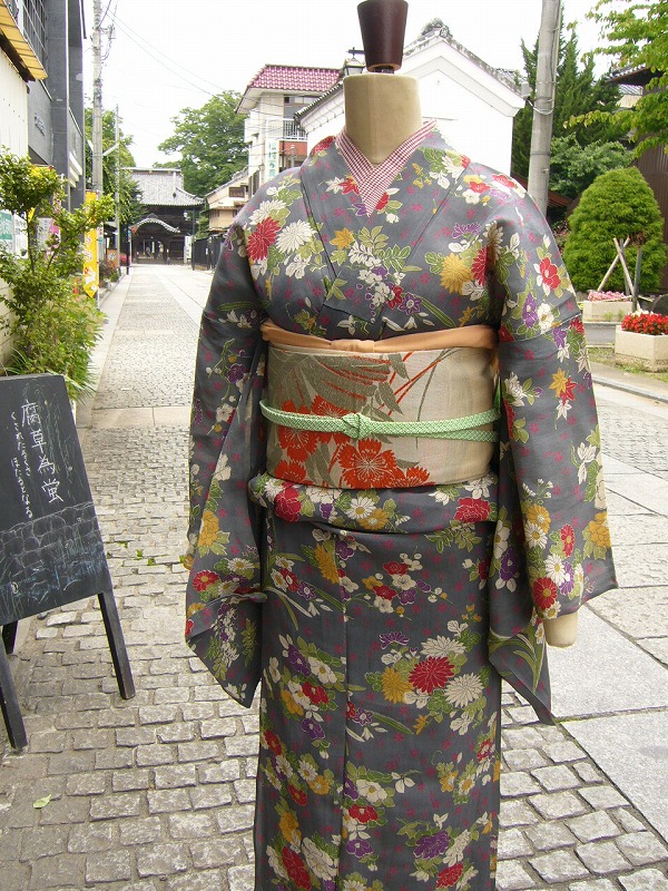 着物:アンティーク単衣・小紋・藍鼠色に花々