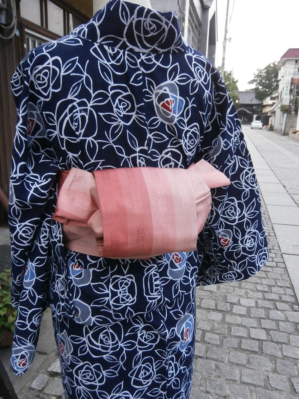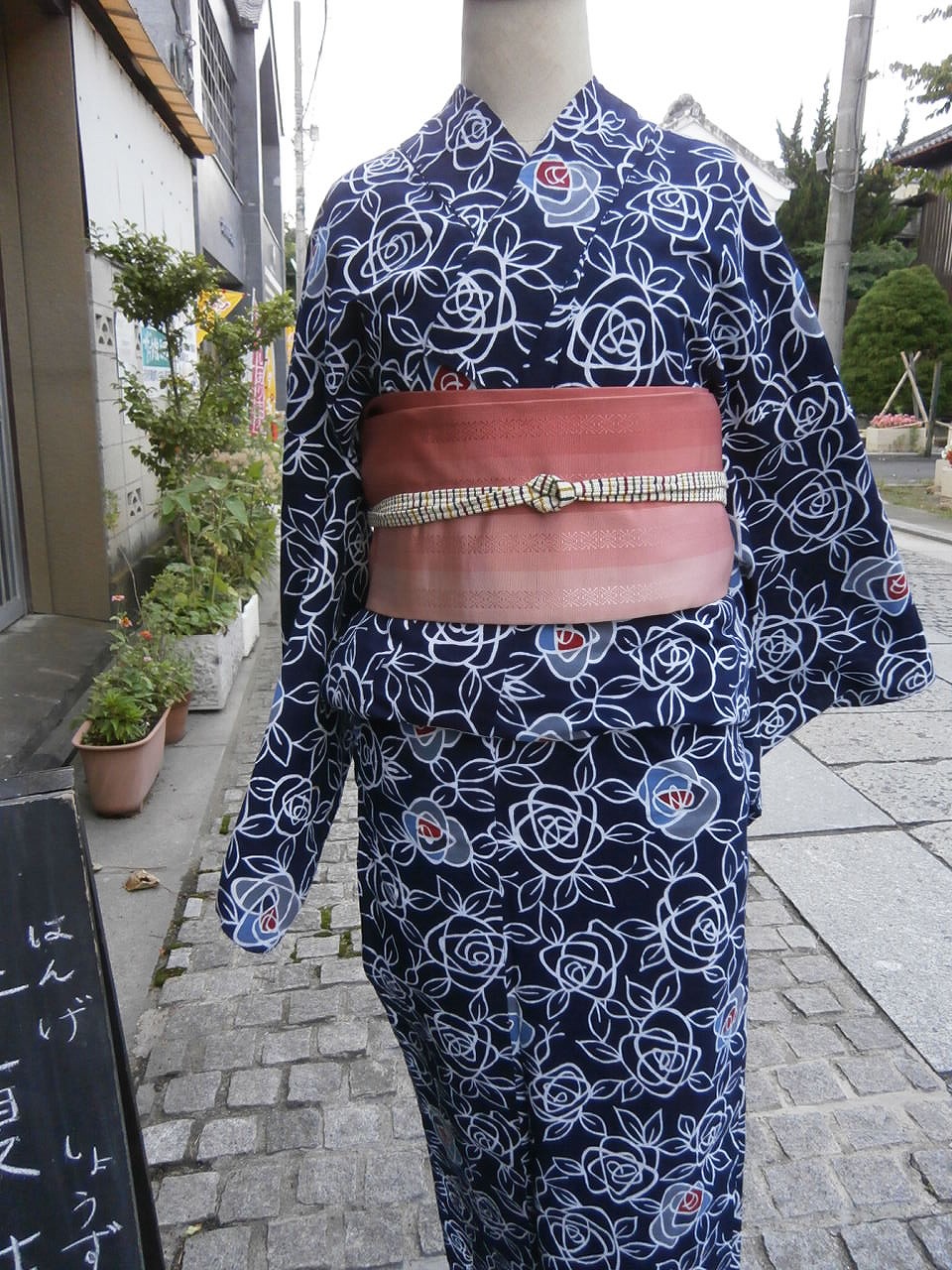藍地にちょこっとデコな雰囲気のバラがかわいい浴衣です++