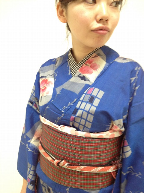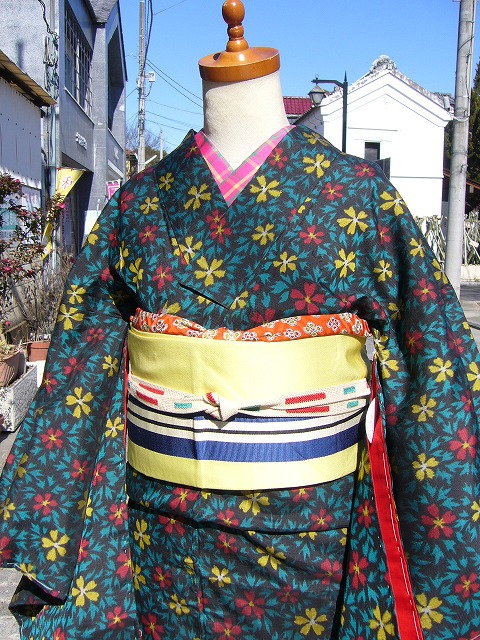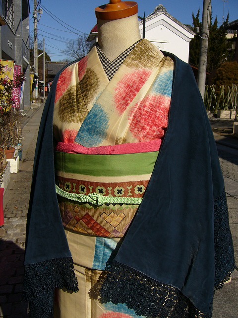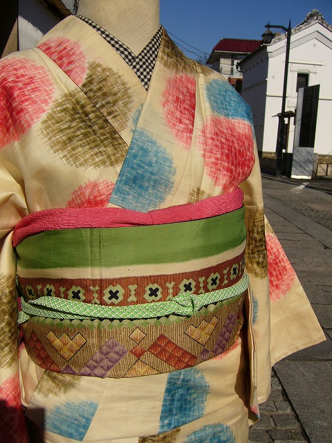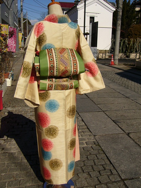 大きな綿菓子の様な水玉がかわいい銘仙キモノのコーディネートです。