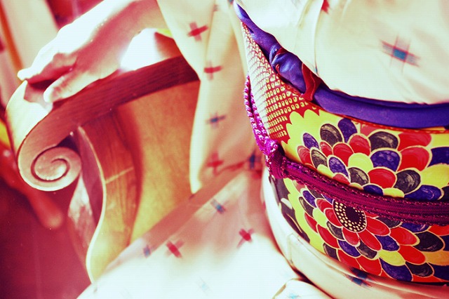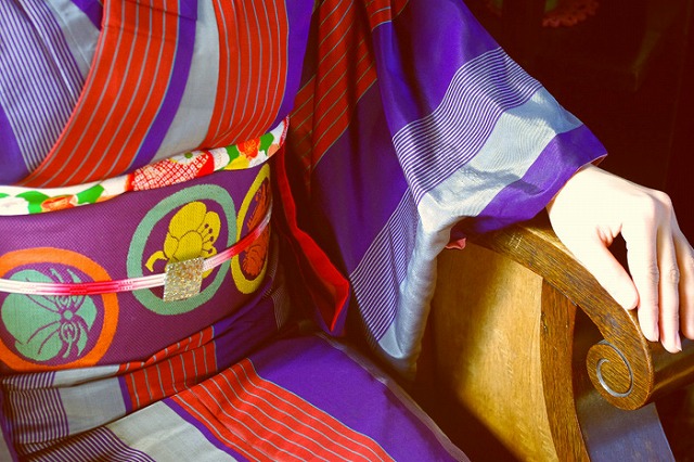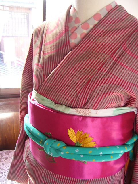 間に入った帯揚げと帯締めの色が引き締め役になっています。