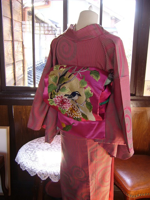 着物 袷 ピンク色 縞にうずまき模様 ¥8,925