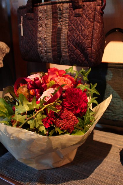 鮮やかな鶏頭はお庭に咲いたというお客様に頂いたもの。