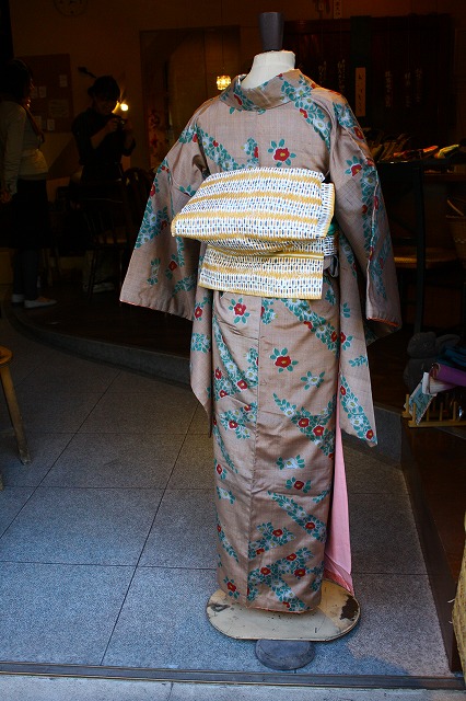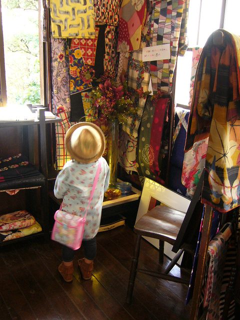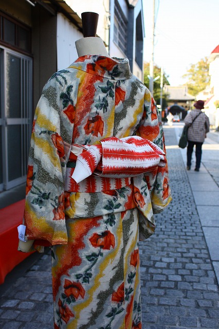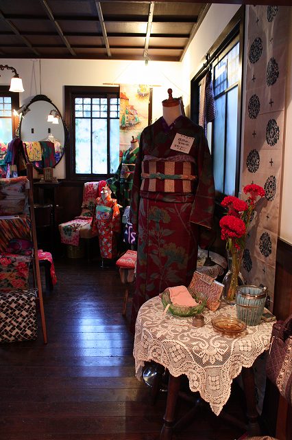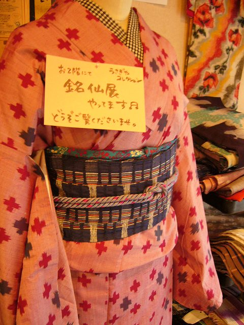 銘仙着物が入口にたくさん置いてあります。