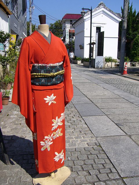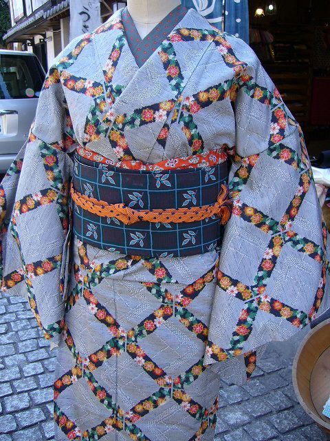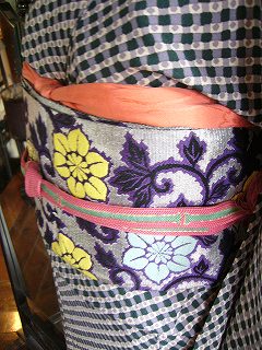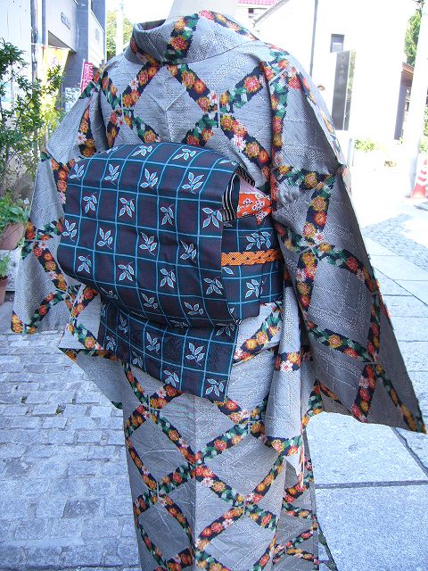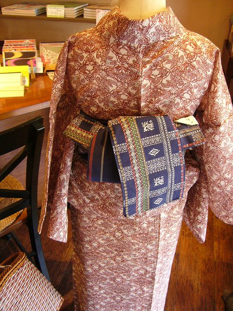 右上)レンガ色の染めの絹紅梅に青地の半幅を合わせました。