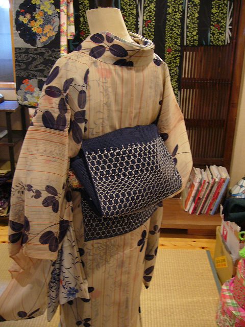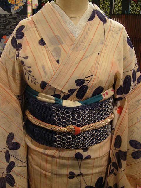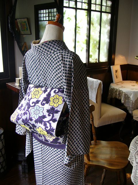 蒸し暑く夏の空気が入り混じるこんな日は、銀色地に淡い黄色と水色が爽やかな鉄線が織り込まれた単の帯を合わせてみたり。