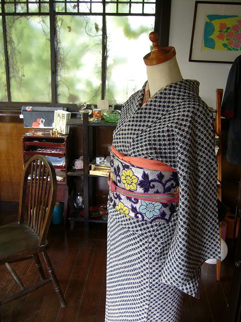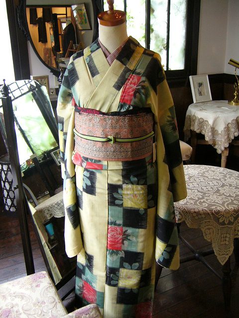 +++++そしてこちらは先日お嫁に行ったばかりの変わり市松にバラの銘仙。