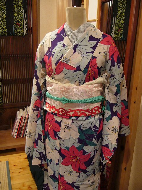 右)新入荷!!アンティーク絽着物 紫 百合と楓 ¥16800より半額!!