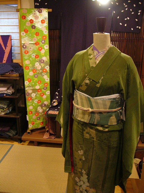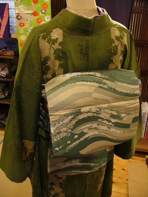 うぐいす色のお散歩着。アンティーク付け下げ風 蔓草