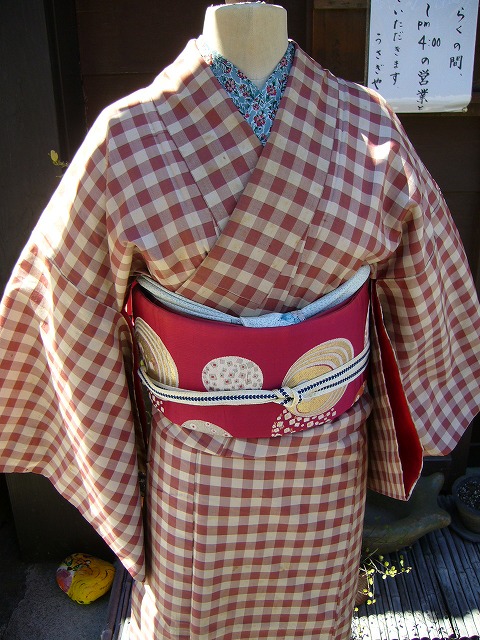 モカ茶ギンガムチェックの銘仙
