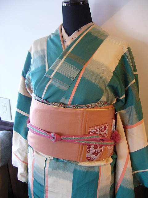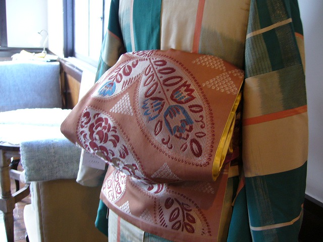 ミドリ格子文様 御召 袷着物