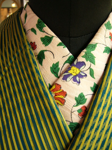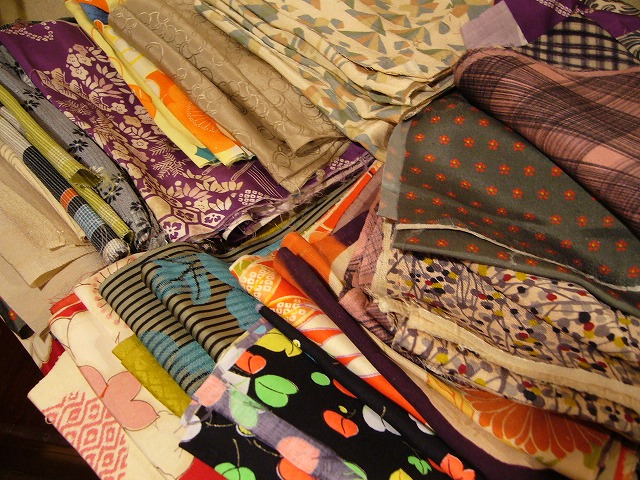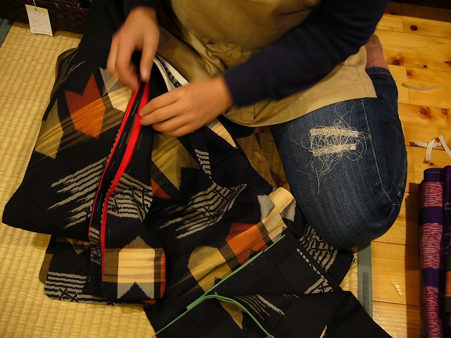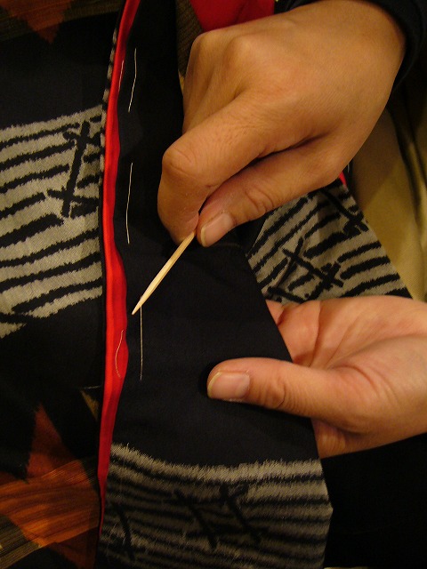 お着物に仕立てたまま一度も袖を通していないものによく躾けがかかっておりますが、ここにあるほとんどのものが「仕立て替え」と言って、汚れたり、傷が出来たりした着物を一度解き、反物の状態に洗い戻した後もう一度自分のサイズに合わせて着物を仕立て直したもの。