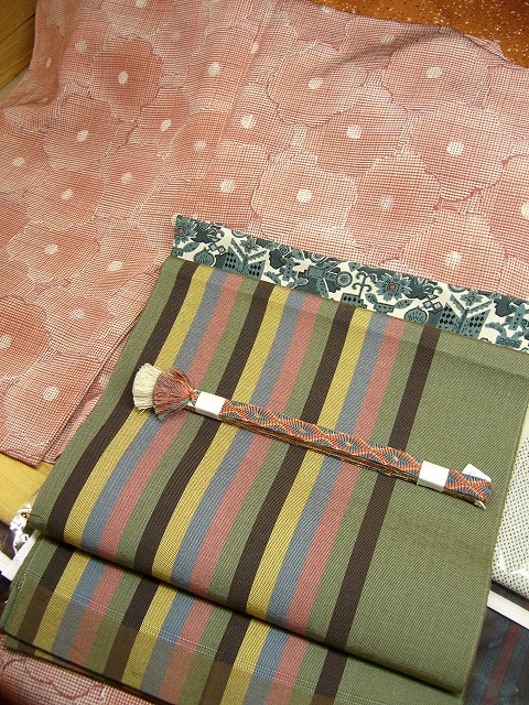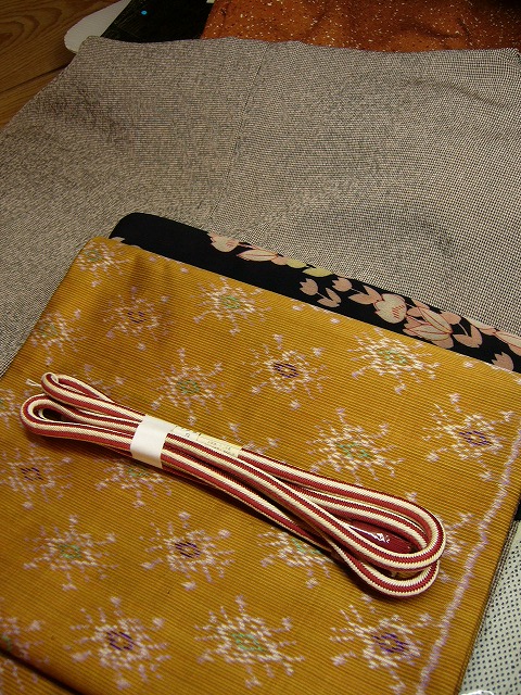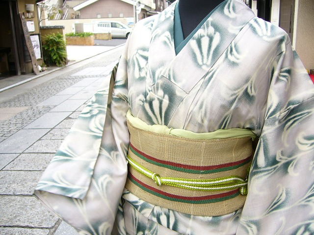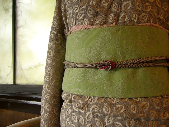 挿し色に明るめのゴールドイエローと濃い葉っぱ色の帯締めで。