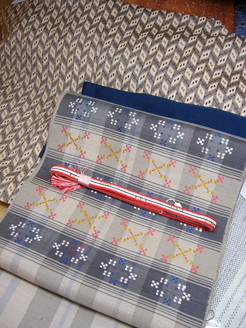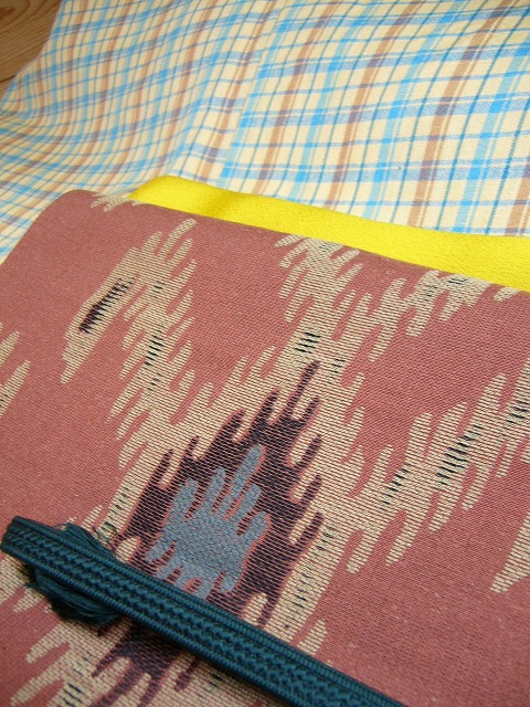 紬の単衣にオレンジのクロスステッチ織が利いてる単帯。