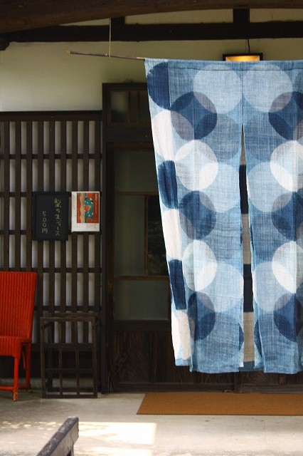 入口、2種類の麻地に藍染ドットを重ねた暖簾がとってもとっても素敵。