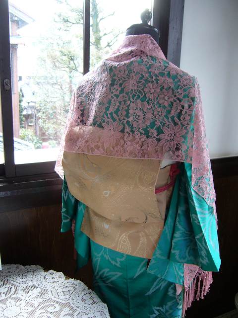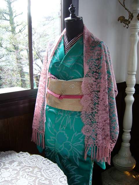 大きな花の柄になっています。レースのショールをかけているのですが、お着物は小物で印象が変わりますね!おしゃれな雰囲気。