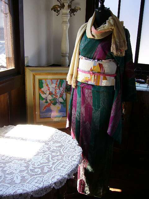 上)緑と紫色の矢絣。ペイズリー柄。まるで孔雀の羽根のようなお着物。