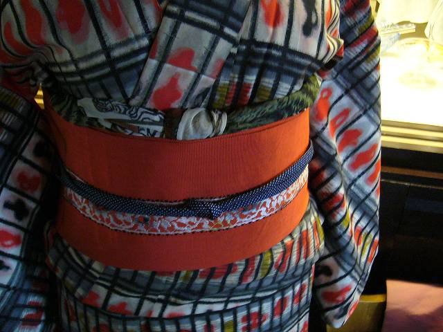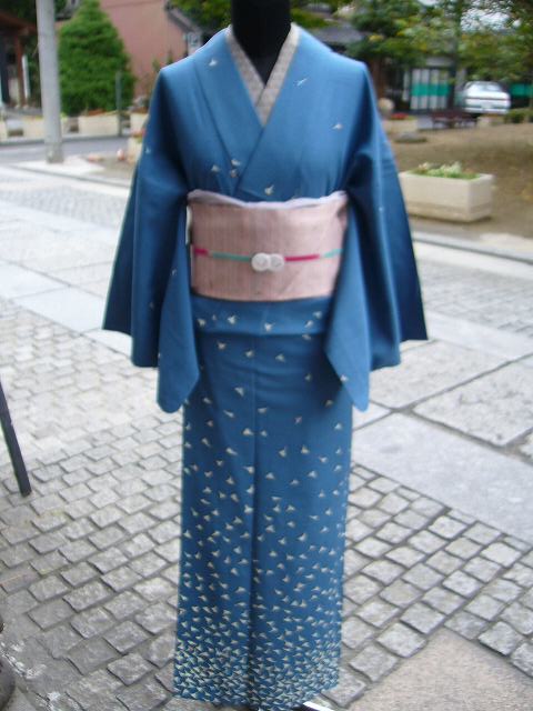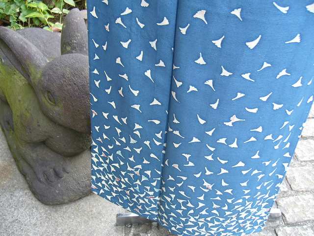 こちらのお着物の方はロウケツ染めなのですが、イチョウの葉が沢山ヒラヒラと舞っています。