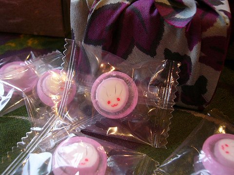 ↓うさぎやオリジナル飴と、福だるまビスケット。銘仙の着物から風呂敷を作り、ボックスを包んでいます*